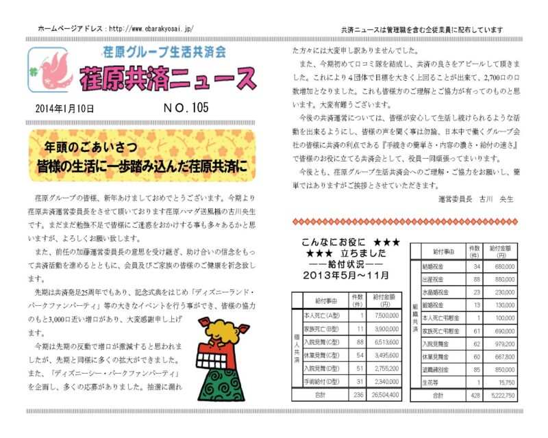 No105 2014年年頭のごあいさつ 皆様の生活に一歩踏み込んだ荏原共済に 2014 1/10 共済ニュース 2014年1月10日 共済ニュースNo105を発行しました。下記よりご覧いただけます。 共済ニュース 共済ニュース No104 加入拡大月間終了 たくさんの加入ありがとうございました! No106 第27回 運営委員会 開催